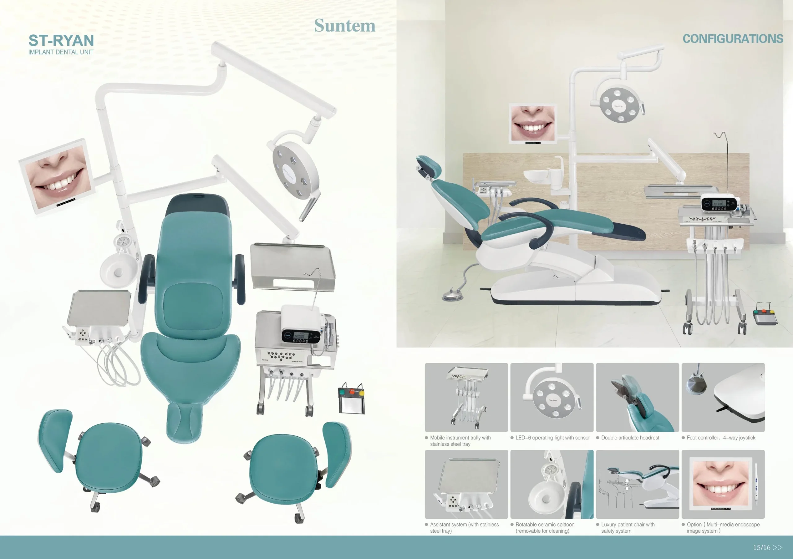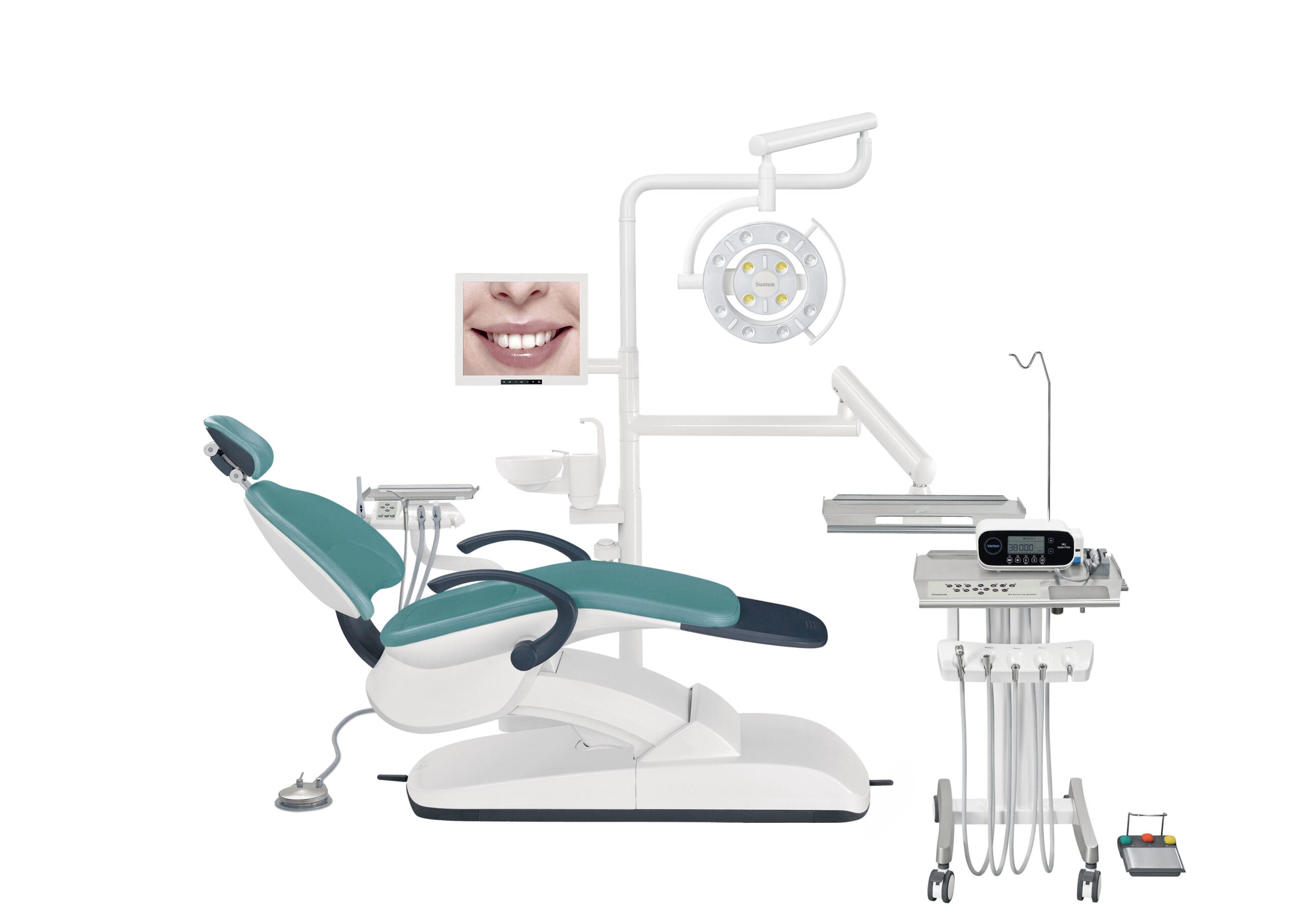 El equipo cuenta con un sistema de llenado automático de la taza con sensor (1 juego), un visor de películas LED (1 set), una caja de conexiones externa (1 juego), un sistema de imágenes de endoscopio multimedia (1 unidad) y una bomba de succión importada (1 juego). En cuanto a sus parámetros técnicos, presenta un voltaje nominal de AC 220V / 50Hz, un voltaje de motor de DC 24V, presión de agua entre 0,2MPa y 0,6MPa, presión de aire entre 0,5MPa y 0,8MPa, una capacidad máxima de carga de hasta 180 kg y un rango de altura de la silla del paciente de 400 a 800 mm.